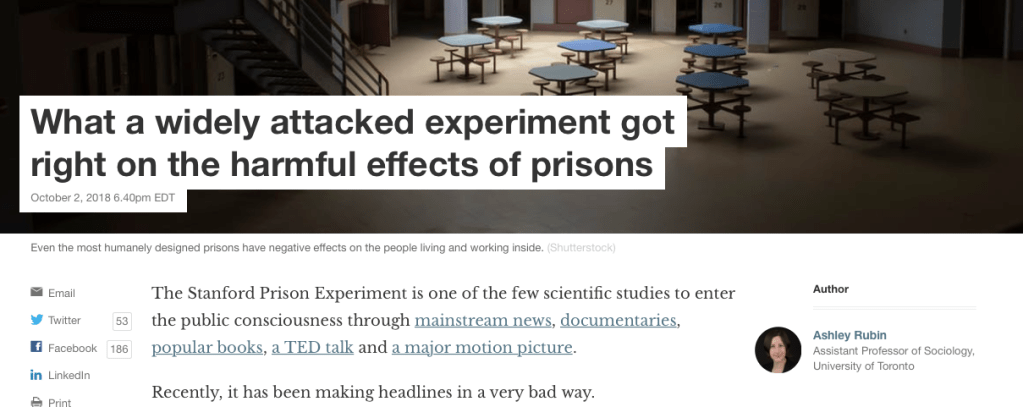 Previously, I weighed in on the current controversy over the Stanford Prison Experiment (SPE). Recently, some commentators challenged the veracity of the SPE and its findings. In an article for The Conversation, I draw on research about historical and contemporary prisons to argue that, whatever its methods, the SPE’s findings were valid: prisons are harmful for the people who live and work within.