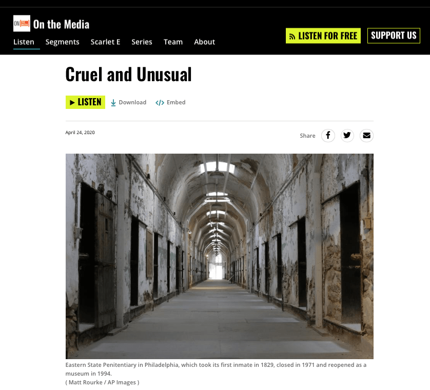 In January 2021, I participated in a Q&A about my book on Eastern State Penitentiary and what it tells us about prisons today in an event, Unpacking the Origins of America’s Modern Prison System, hosted by Eastern State Penitentiary‘s Searchlight Series. The event was live streamed on facebook.